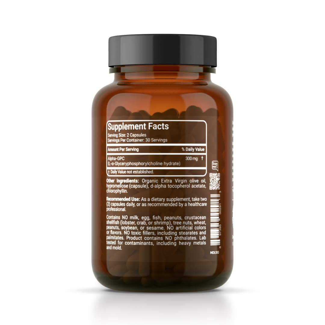 Alpha-GPC serves as a choline source and is a naturally occurring compound that acts as a precursor to the neurotransmitter acetylcholine, and acetylcholine plays an important role in cognitive function, which includes memory, attention, learning and helps to optimize brain function.