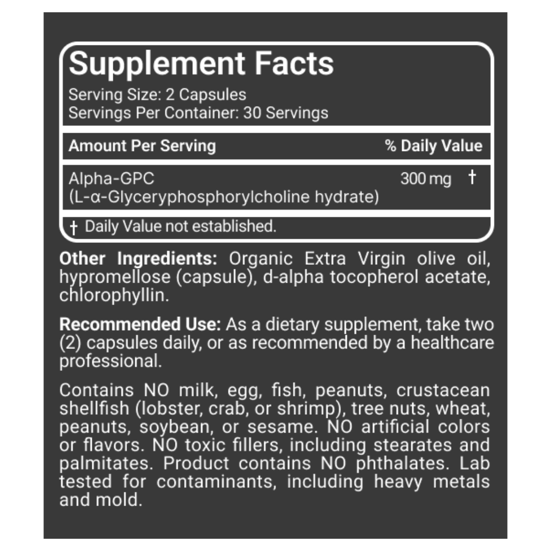 Alpha-GPC serves as a choline source and is a naturally occurring compound that acts as a precursor to the neurotransmitter acetylcholine, and acetylcholine plays an important role in cognitive function, which includes memory, attention, learning and helps to optimize brain function.